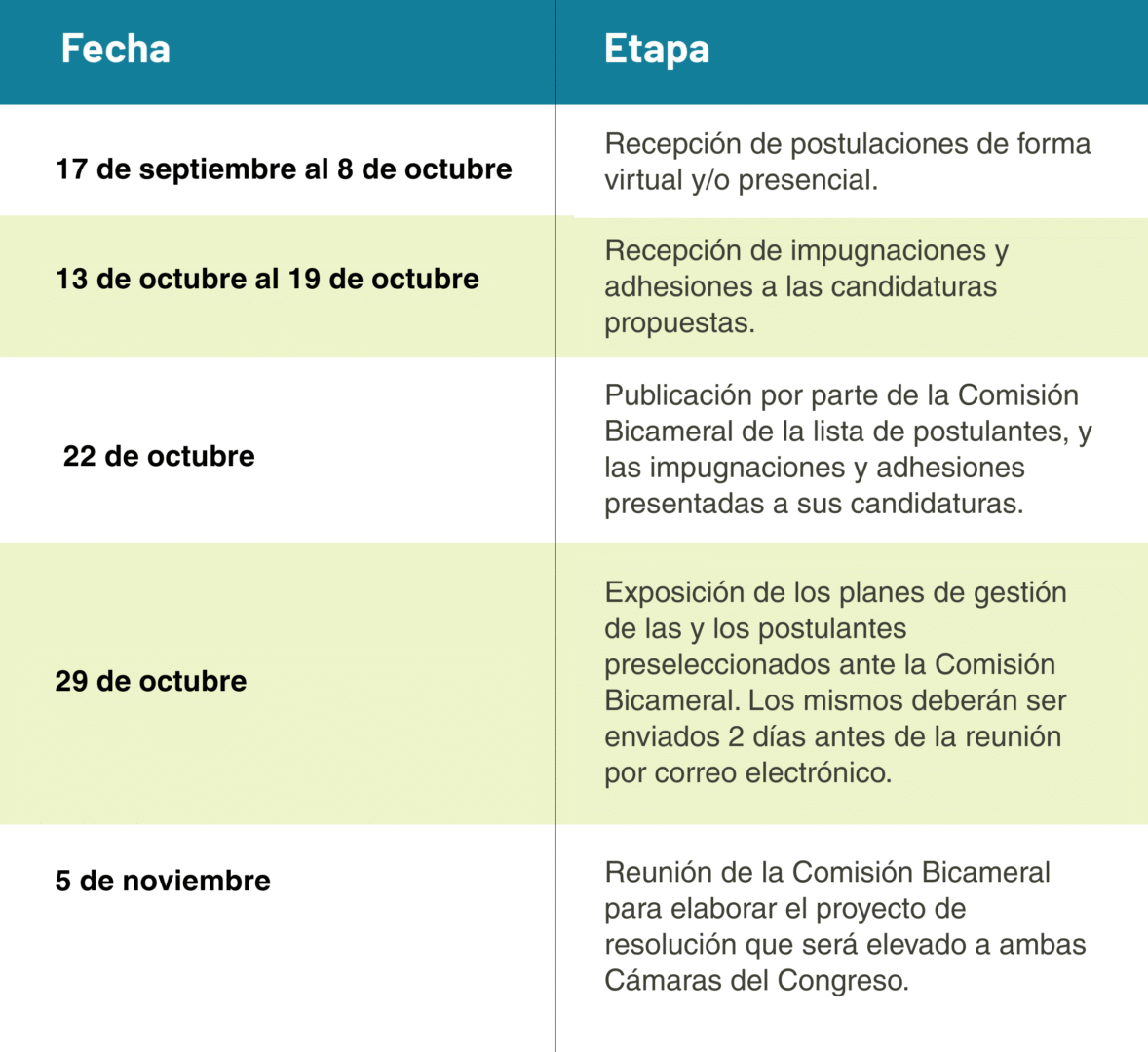 La Comisión Bicameral estableció el siguiente cronograma para el proceso de designación: