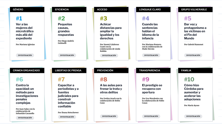 Las piezas periodísticas desarrollan iniciativas de diversa índole, incluyendo políticas para garantizar el acceso a la justicia de grupos vulnerabilizados; acompañar a víctimas de delitos; juzgar con perspectiva de género, en particular en casos de microtráfico de drogas; profesionalizar la investigación de crímenes complejos; prevenir la trata de personas; promover la apertura judicial; capacitar a integrantes del sistema de justicia; y agilizar procesos de adopción. Las propuestas fueron seleccionadas a partir de una convocatoria abierta y luego investigadas siguiendo una metodología específica. Los resultados de las investigaciones serán presentados el día 18 de marzo a las 16 hs. en un evento híbrido transmitido por Youtube.
